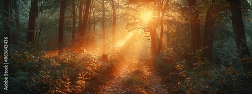 © Viktor, Naklejka premium Bright sun pierces through trees in foggy, wooded area Trail visible in foreground