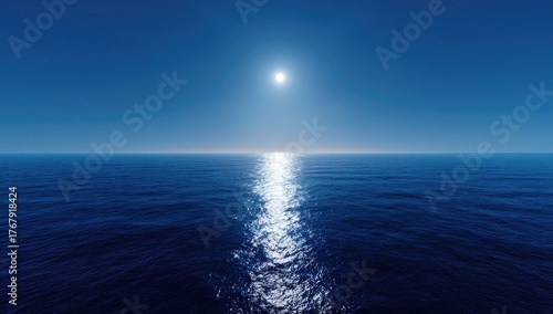 © M, Obraz premium Bright sun shines on the calm blue ocean under a clear sky.