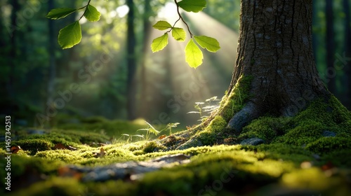 Fototapeta premium Bright sunbeam pierces through the dense canopy, casting long shadows on the mossy forest floor.