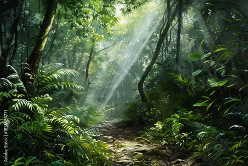 Naklejka premium Bright sunbeams illuminate a path through a lush, green tropical rainforest,...