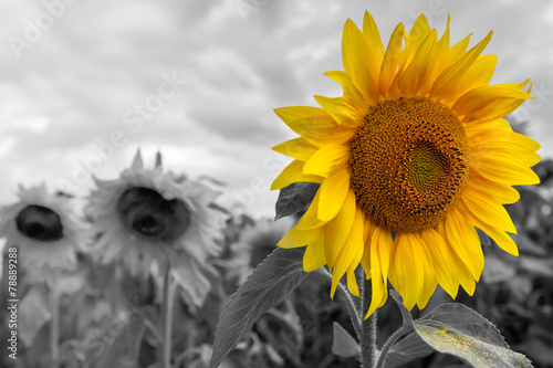 Fototapeta premium Bright sunflower on a grayscale sunflowers background
