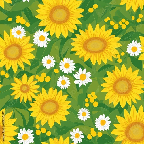 Fototapeta premium Bright sunflowers and daisies create a vibrant floral pattern on a lush green...