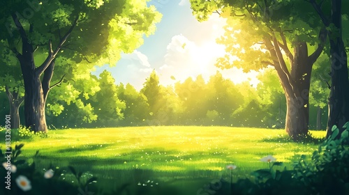 © Almultazam, Fototapeta premium Bright sunlight illuminates a clearing surrounded by tall, lush trees in a vibrant natural setting