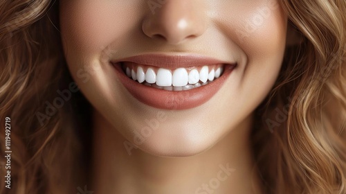 Obraz premium Bright sunlight illuminates a joyful woman with curly hair, showcasing her radiant smile and white teeth while she enjoys a lovely day in a lush park surrounded by blooming flowers