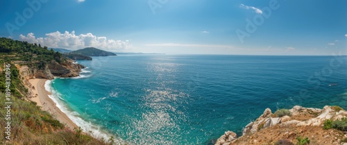 Fototapeta premium Bright sunlight illuminates the beautiful Mediterranean Sea as it hits the rocks