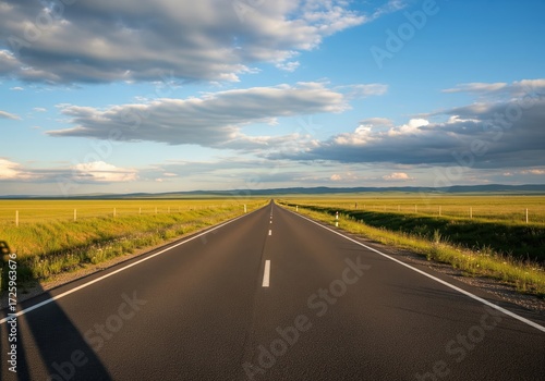 © Vadym, Naklejka premium Bright sunlight on an endless straight asphalt road stretching towards blue horizon, symbolizing freedom, exploration, and the spirit of adventurous travel