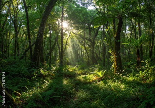 Obraz premium Bright sunlight pierces through the dense canopy of a lush, verdant forest floor