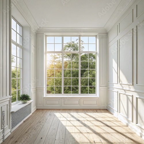 Obraz premium Bright Sunlight Room Interior: Large Window, White Walls, Hardwood Floor