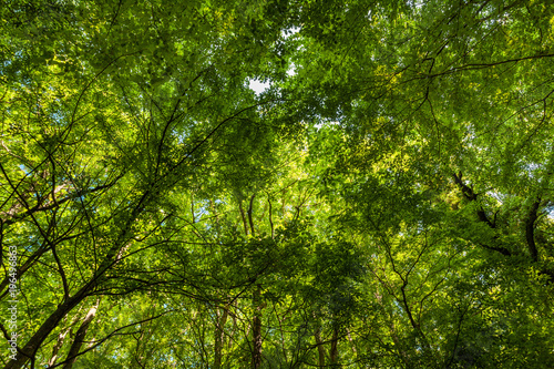 © mitev, Obraz premium Bright sunlight shines through the green forest trees