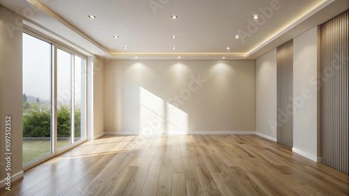 © Vibrant Visions Pixe, Obraz premium Bright, Sunlit Empty Room with Hardwood Floors and Modern Accents