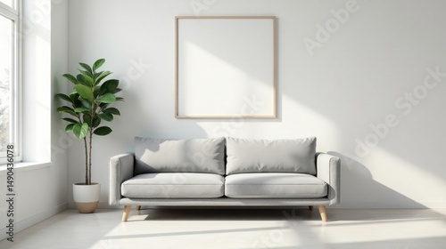 © araet, Fototapeta premium Bright sunlit living room interior design with a cozy light gray sofa and a large empty picture frame on a white wall, featuring a potted plant