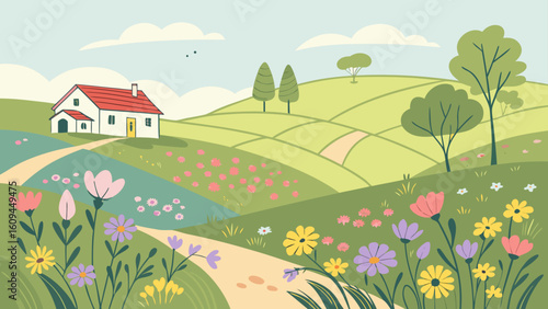 © Chimera, Fototapeta premium Bright Sunny Country Vector Scene - Rolling Hills Green Meadows Colorful Flowers Peaceful Farmhouse Spring Landscape