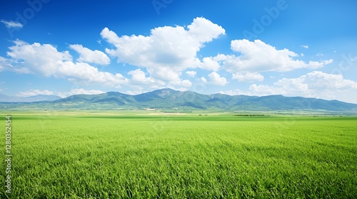 © Maftuhin, Obraz premium Bright Sunny Day Landscape with Lush Green Field and Distant Mountains