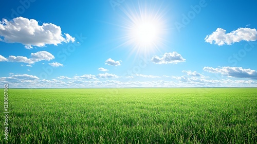 Obraz premium Bright Sunny Day Over Vast Green Field Under Blue Sky