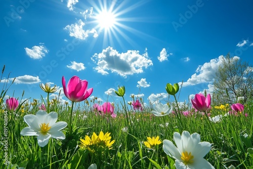 Fototapeta premium Bright sunny day with blooming daisies in a green field under a blue sky filled with clouds