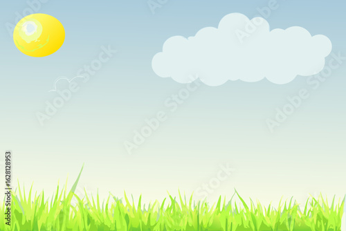 Obraz premium Bright sunny day with fluffy cloud green grass and a distant bird in a clear...