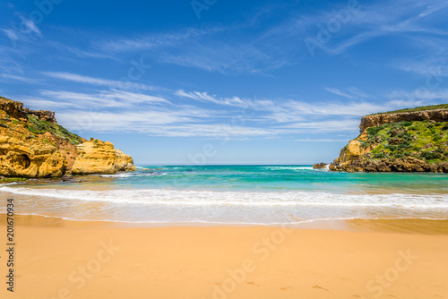 © Thomas Jastram, Fototapeta premium Bright sunny summer coast view to beautiful flowers plants sandy beach bay walk & surfing at rocks sand limestone cliff of Great Ocean Road, Melbourne, Port Campbell National Park, Victoria/ Australia