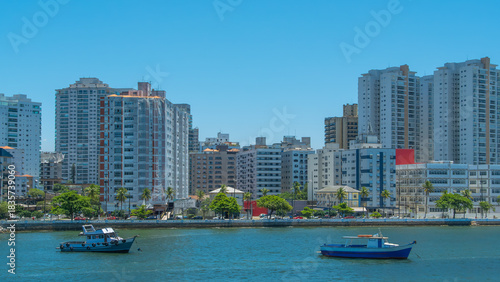 © John_Doo78, Fototapeta premium Bright, sunny view of a Brazilian city skyline, featuring modern apartment buildings overlooking a harbor with small fishing boats on the clear blue water