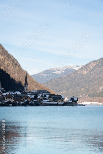 © Abiwoo, Obraz premium Bright sunny winter day, Alps, Hallstatt lake and village view.