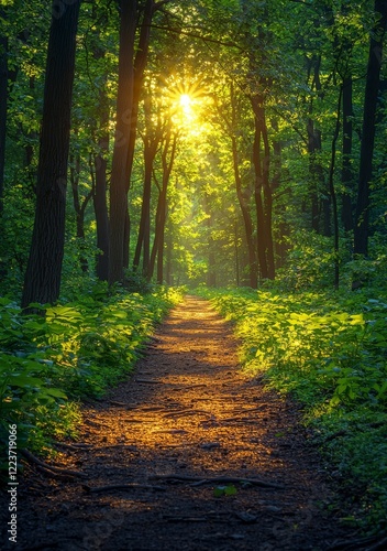 Obraz premium Bright sunrays gracefully cascade through the trees in a park, with a path...