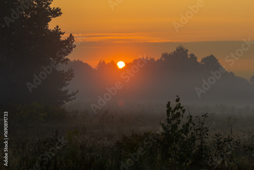 © heshixin, Fototapeta premium Bright Sunrise Over Autumn Forest at Field’s Edge
