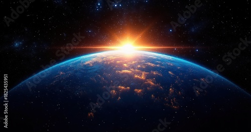 Obraz premium Bright sunrise over planet Earth seen from space with glowing clouds and sparkling stars in the dark universe