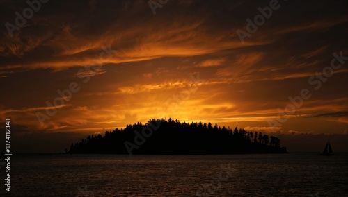 Naklejka premium Bright sunset casting warm hues over treetops against a dark sky, autumn...