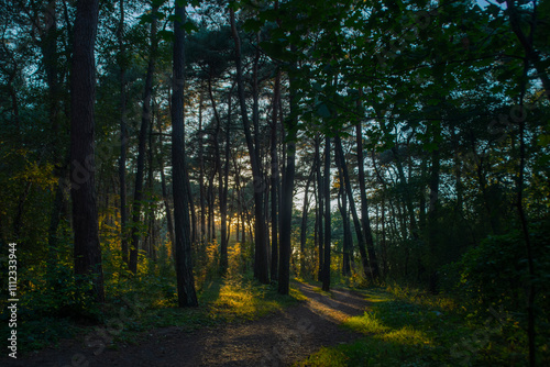 © Николай Батаев, Naklejka premium Bright sunset sun shines beautifully through pine trunks. Background with summer evening in the forest.