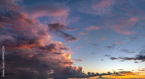 © bilanol, Fototapeta premium Bright sunset with setting sun behind vivid orange and yellow clouds