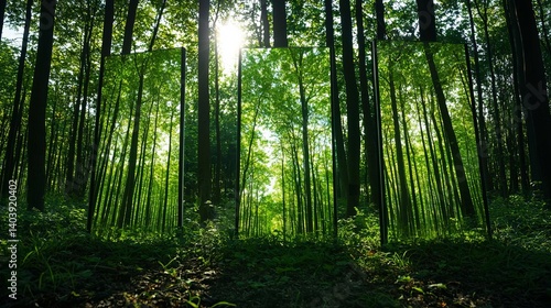 Naklejka premium Bright sunshine illuminates a green forest scene, reflecting in strategically...