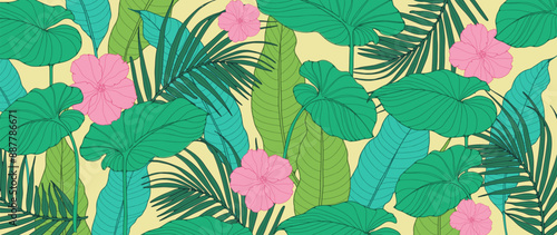 Fototapeta premium Bright tropical foliage background. Tropical plants and flowers. Vector botanical illustration