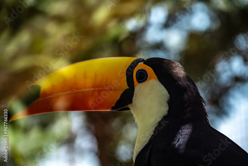 © константин константи, Naklejka premium bright tropical toucan in greenery on a tree on a sunny day on the island of Crete Greece