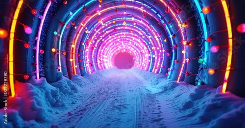 Fototapeta premium Bright tunnel glows with vibrant neon lights. Snow surrounds path leading...