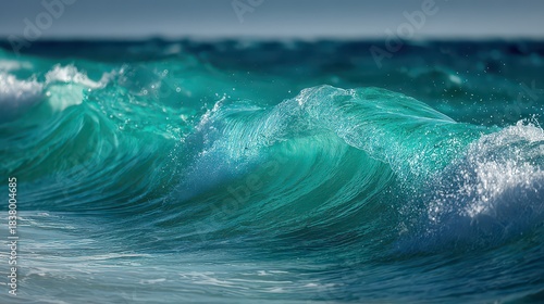 © HadilCreative, Obraz premium Bright Turquoise Ocean Wave Crashing with Sparkling Water Droplets in Sunlight