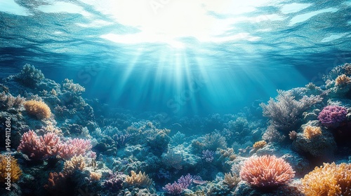 Fototapeta premium Bright underwater scene with sunlight rays penetrating the water surface illuminating colorful coral reef formations