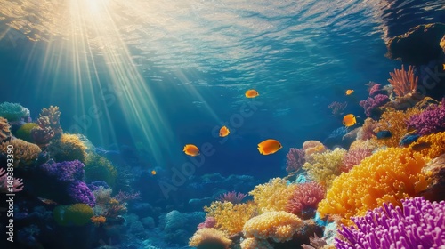 Fototapeta premium Bright underwater world with corals and yellow fish. Sunlight underwater.