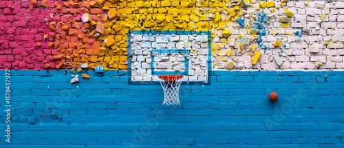 Fototapeta premium Bright Urban Basketball Court with Colorful Brick Wall and Basketball Ready...