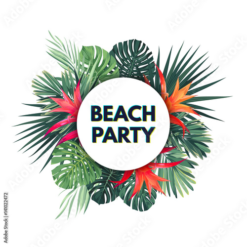 Fototapeta premium Bright vector floral banner template for summer beach party. Tropical flyer...