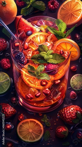 © Suradet Rakha, Fototapeta premium Bright vector image of a fruit punch bowl with ladle and floating fruit slices.