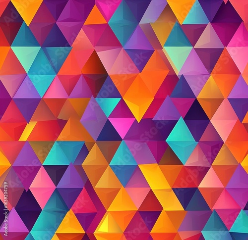 © Endri, Obraz premium bright vibrant multicolored geometric pattern with overlapping triangular and pyramid shapes creating dynamic abstract composition