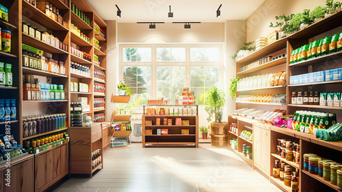 © Nano Photos, Naklejka premium Bright, well-organized health food store interior with wooden shelves stocked with various products and natural light from large windows.
