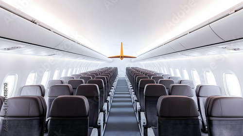© artzone, Fototapeta premium Bright White And Blue Modern Airplane Cabin Interior With Empty Grey Seats And Aisle Perspective View 3D Render