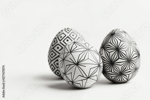 Fototapeta premium Bright white backdrop, minimalist monochrome geometric patterned eggs.