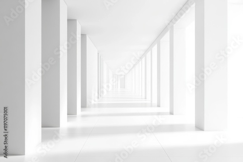 Fototapeta premium Bright white corridor with columns and natural light illuminating space