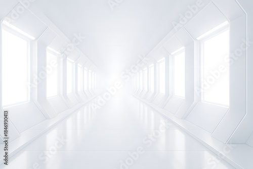© Sufiun360, Obraz premium Bright white corridor with repeating windows and endless perspective