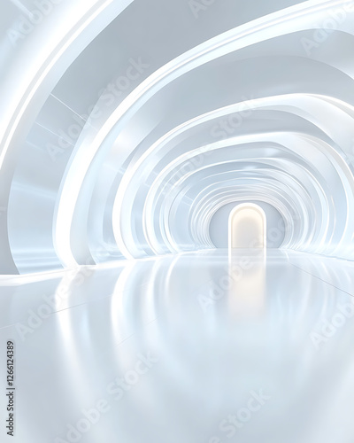 © watz, Obraz premium Bright, white corridor with smooth reflective floors and curved, illuminated architectural features leading to a distant doorway.