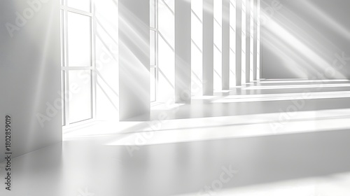 Obraz premium Bright white corridor with sunlight streaming through windows creating light and shadow patterns