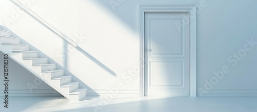 Obraz premium Bright White Interior featuring Minimalist Stairs Leading to a Second Floor Door with Soft Light and Empty Space for Text in Modern Design