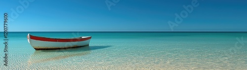 © Saba, Naklejka premium Bright White Nostalgic Ferry with Red Stripe Cruising Peacefully Across Sparkling Blue Ocean Waters