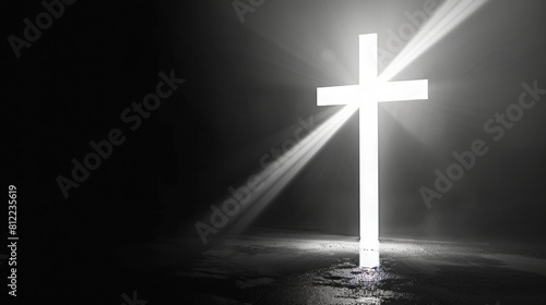Fototapeta premium bright white shining cross, black background,, copy and text space, 16:9